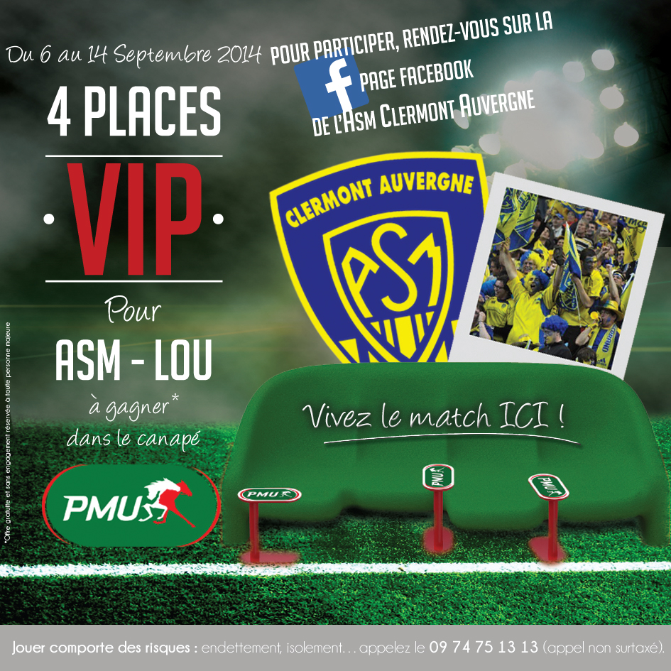 Le 20 septembre prochain, le club de rugby de l’ASM Clermont Auvergne reçoit le LOU Rugby. Pour cette rencontre de TOP 14, le club met en place la désormais célèbre activation money can’t buy du « Canapé PMU ». Ce dernier sera sera installé sur la pelouse au bord du terrain et au plus près des joueurs. Jusqu’au 14 septembre prochain, les Fans du club sont invités à poster une photo sur l’application installée installée sur la page Facebook de Clermont. Un tirage au sort sera effectué parmi les 10 photos les plus likées. Le grand vainqueur aura la possibilité d’assister au match ASM-LOU Rugby accompagné de 3 personnes de son choix sur le « canapé PMU ».