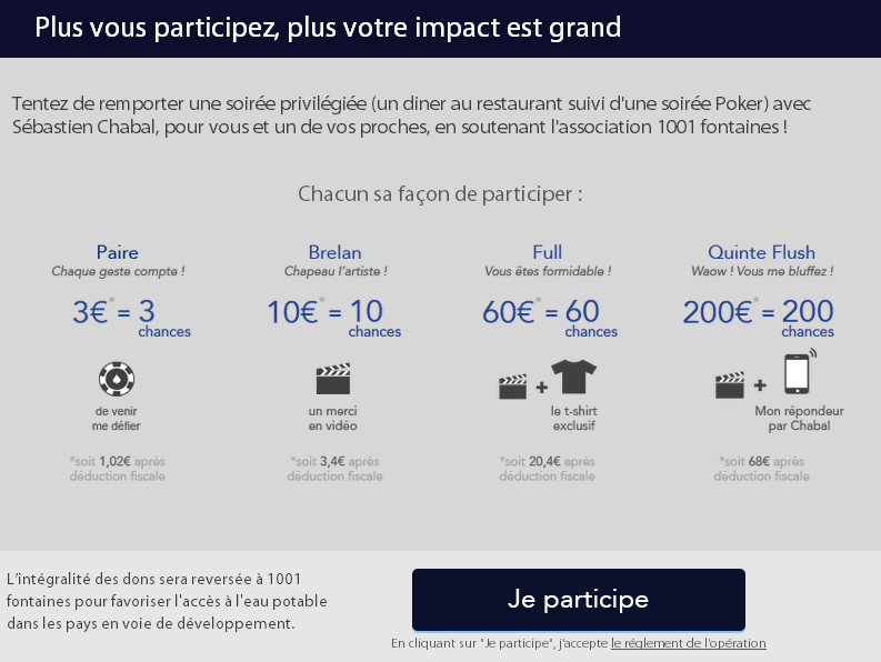 Grâce au dispositif simple de don « en un clic » proposé par le bouton ZeGive, chacun peut effectuer un don simplement. La collecte est accompagnée d’un tirage au sort qui déterminera le vainqueur de la soirée privilège avec Sébastien Chabal et ses amis rugbymen. Au programme : dîner au restaurant, partie de poker et souvenirs mémorables garantis. #MetsChabalAuTapis !