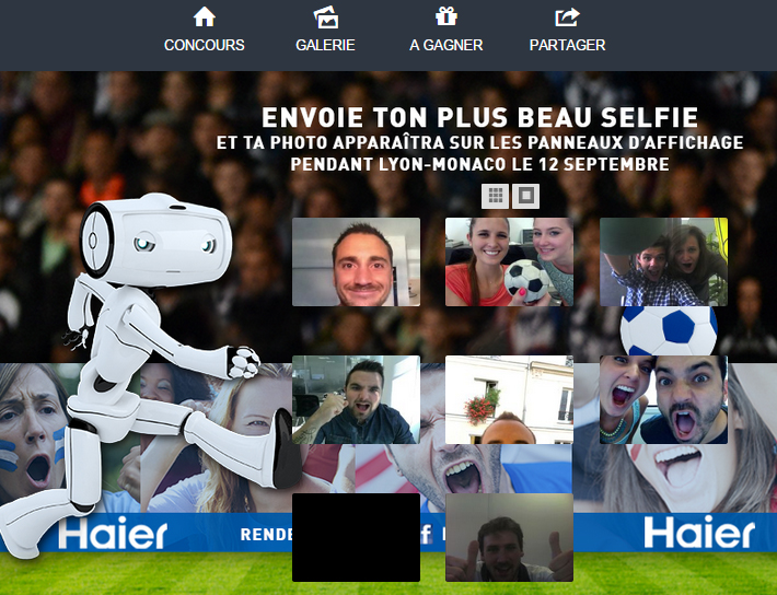 Vendredi, l’Olympique Lyonnais reçoit l’AS Monaco dans le cadre de la 5e journée de Ligue 1. A cette occasion, la marque Haier (électroménager, TV) offre la possibilité aux Fans de s’afficher sur la panneautique du Stade Gerland pendant la rencontre. Comment participer ? Il vous suffit d’envoyer votre plus beau « selfie foot » sur la page Facebook d’Haier jusqu’à demain midi. 10 chanceux seront séléctionnés et auront la chance de découvrir leur selfie s’afficher sur les panneaux LEDS du stade.