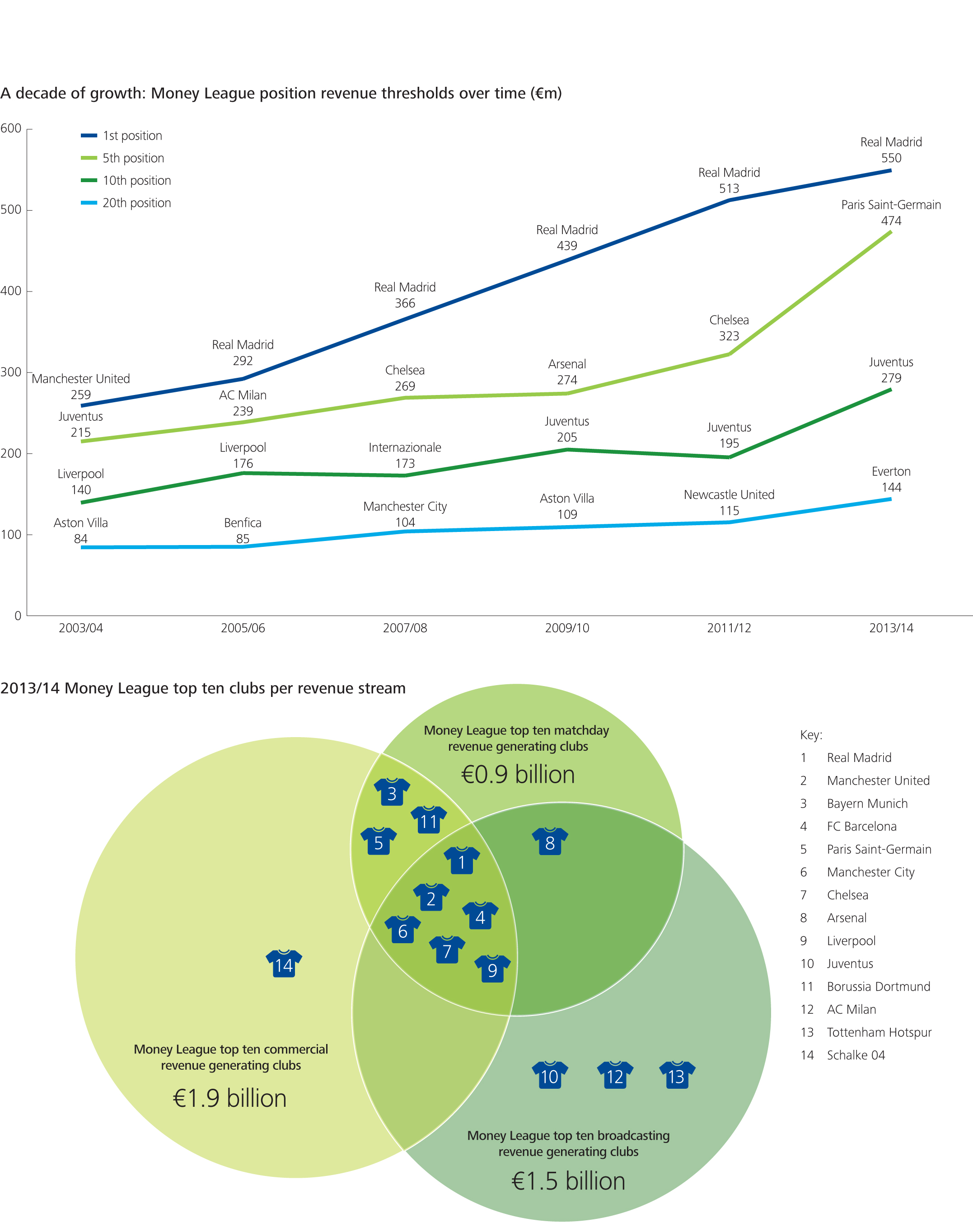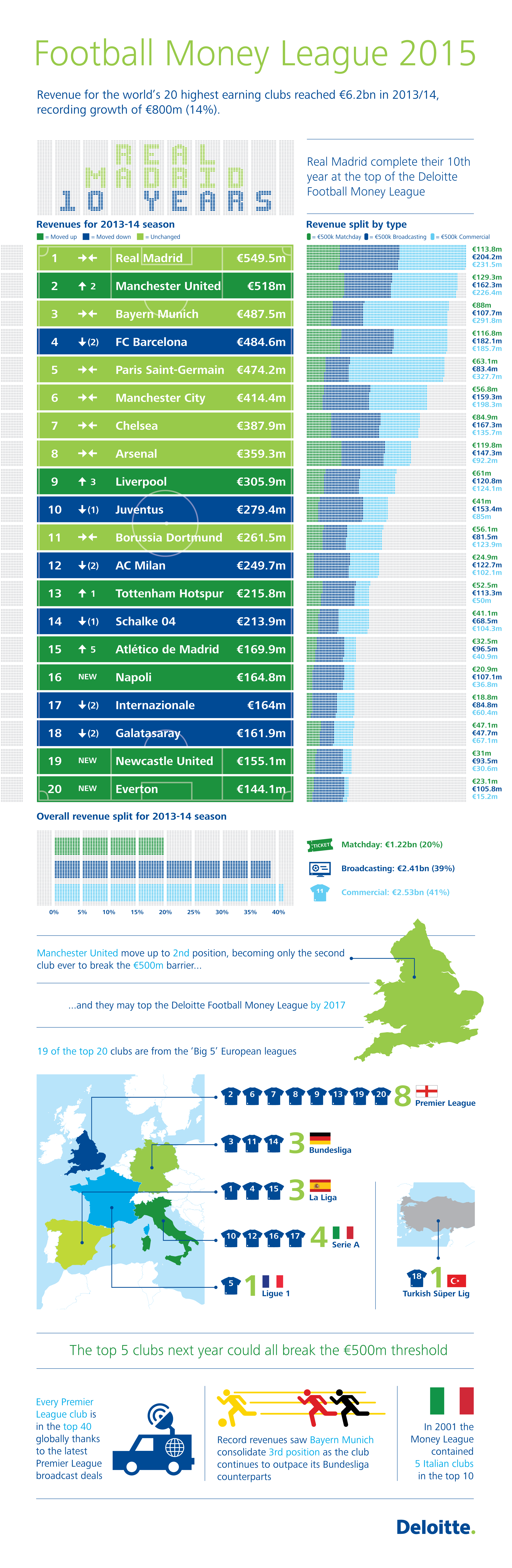 Comme chaque année depuis maintenant 18 ans, le cabinet d’audit et de conseil Deloitte dévoile son étude “Football Money League” portant sur les revenus générés par les clubs de football professionnels et classés en 3 sources : “matchday” (ticketing, hospitalités…), droits TV et “commercial” (sponsoring, merchandising…). Les montants des transferts ne sont ainsi pas pris en compte. Pour la saison 2013/2014, les revenus combinés du TOP 20 des clubs générant le plus d’argent atteignent la somme de 6,2 milliards d’euros, soit une augmentation de 14% par rapport à la saison précédente.