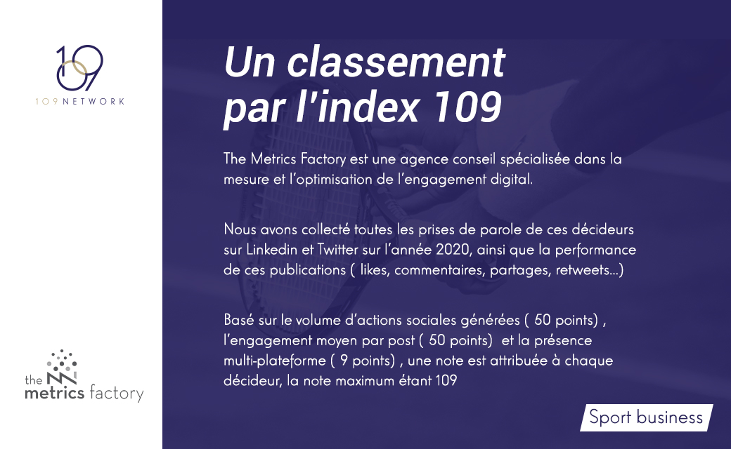 « Ce classement est dans la lignée de nos événement 109 » ajoute Aurélien Flacassier, Co-fondateur 109 et dirigeant associé chez Compétences Phenix. « Nous invitons des top décideurs du monde du sport, détenteurs de droits et annonceurs, à qui nous présentons leur futurs partenaires notamment sur leurs sujets du moment à savoir le digital, le CRM, la data, l’influence, le social média. Cela nous est donc apparu logique de connaître la position et l’influence de ces top décideurs sur les réseaux sociaux. Qui est présent sur les réseaux sociaux ? Comment ? à quel rythme ? et pour quel objectif ? »