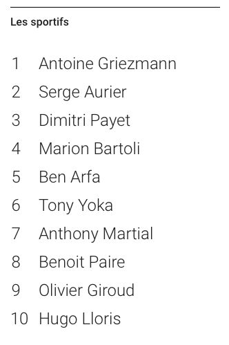 Concernant les sportifs les plus populaires, sans grande surprise, Antoine Griezmann truste la première place devant le spécialiste des faits divers Serge Aurier et Dimitri Payet. Un top 10 qui fait la part belle aux footballeurs.
