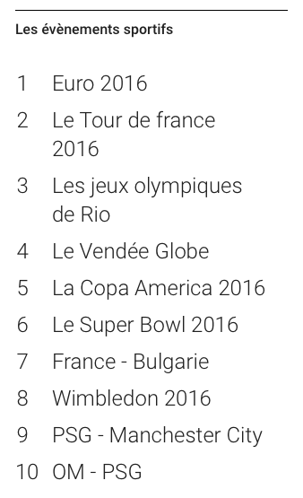Si l’on se penche sur le marché français, le classement est légèrement différent. L’Euro 2016 arrive cette fois-ci en tête devant le Tour de France et les JO de Rio 2016.