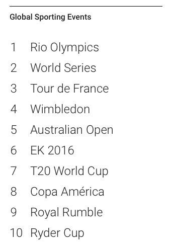 Au niveau mondial, on pouvait s’y attendre, les Jeux Olympiques de Rio 2016 prennent la tête du classement. En seconde position suivent les World Series (baseball – MLB) et le Tour de France qui clôture lui le podium. l’Euro 2016 (EK 2016) arrive seulement en 6ème position.