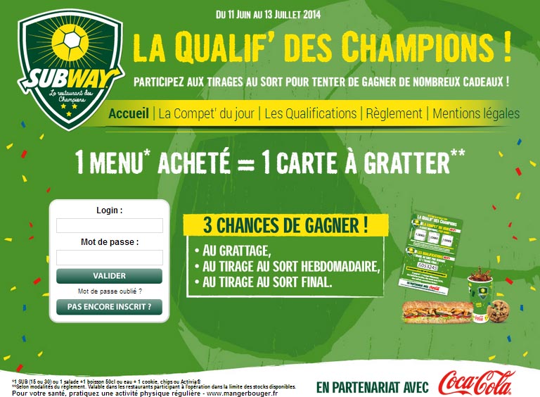 Mais Subway ne s’arrête pas là puisque la chaîne de restauration à signé un partenariat avec l’icône Pelé l’été dernier. Pour activer ce partenariat, Subway organise « La Qualif des Champions », une opération qui offre la possibilité aux clients achetant un menu de recevoir des cartes à gratter. De nombreux lots sont ainsi mis en jeu (cookies, boissons, mini-ballons, sacs de sport, kit supporters, babyfoot…). Chaque carte, gagnante ou perdante, comporte également un code permettant d’accéder aux « Qualifications », un dispositif qui se déroule via le site www.subwaychampions.fr. Le client peut ainsi participer à un tirage au sort hebdomadaire qui désigne les gagnants d’un weekend UCPA et de 4 coffrets « sensations fortes ».