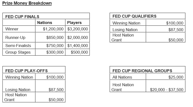 Au total, la nouvelle compétition promet une dotation financière globale de 18 millions de dollars dont 12M$ pour les joueuses et 6M$ pour les fédérations nationales. Dans le détail, les joueuses qui remporteront la prochaine Fed Cup auront une dotation directe de l’ITF de 3,2 millions de dollars à se partager. La fédération aura elle un chèque d’1,2M$.