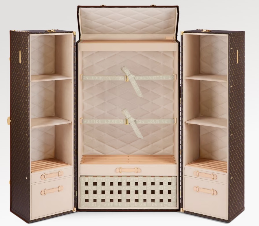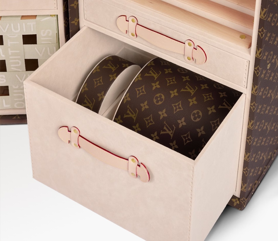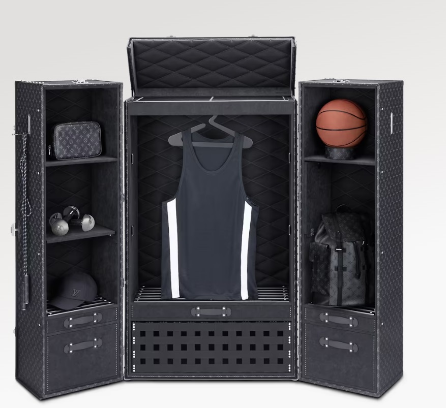 Cette malle vestiaire Louis Vuitton contient bien évidemment quelques pièces de la marque comme un sac Speedy P9 bleu que l’on retrouve dans la nouvelle collection dessinée par Pharrell Williams et incarnée notamment par LeBron James. Un sac dont le plus grand modèle est en vente au prix de 10 000€.