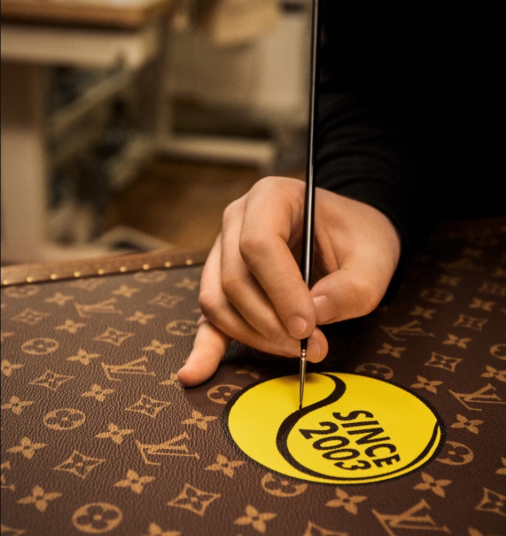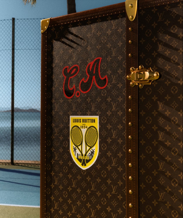 Louis Vuitton a personnalisé la malle vestiaire de Carlos Alcaraz avec quelques détails comme les initiales du joueur (CA), « Since 2003 » (en référence à son année de naissance, ou encore une silhouette et un blason « Louis Vuitton – Murcia ».