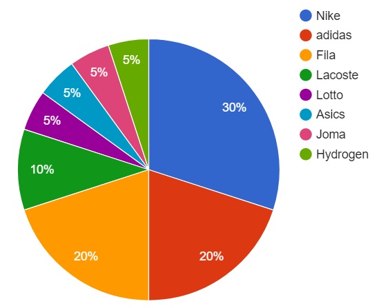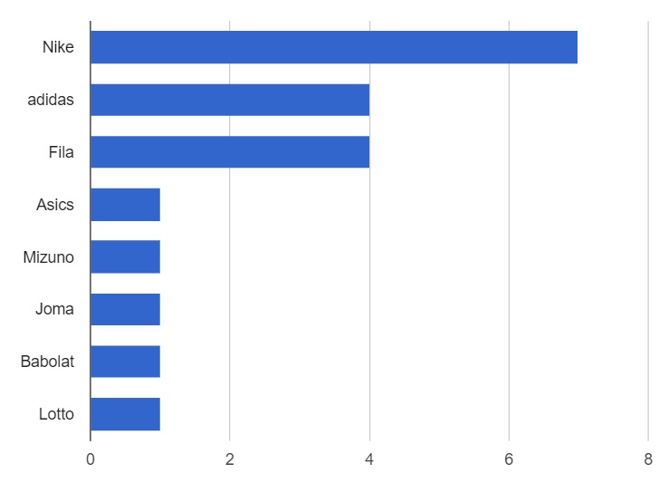 Du côté des chaussures, Nike domine également le Top 20 avec 7 joueurs devant adidas et Fila à égalité avec 4 joueurs. Si pour les deux dernières marques, les 4 joueurs correspondent à ceux équipés en textile, la marque au swoosh équipe un joueur en plus pour les chaussures que le textile avec Chung. Le sud-coréen porte des Nike aux pieds mais évolue avec des polos Lacoste. Pour le moment, la marque au croco ne propose plus de paires pour la pratique du haut niveau.