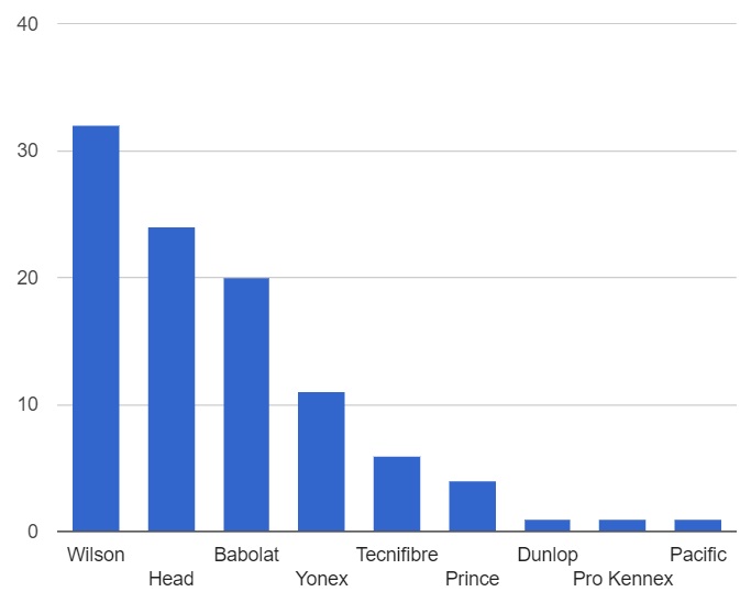Si Wilson est l’équipementier raquette numéro 1 du Top 100, il l’est aussi pour le Top 20. Cette année, la marque possède 7 joueurs (Federer, Dimitrov, Del Potro, Goffin, Carreno Busta, Bautista Agut, Edmund) contre 5 pour Babolat (Nadal, Thiem, Querrey, Sock, Fognini).