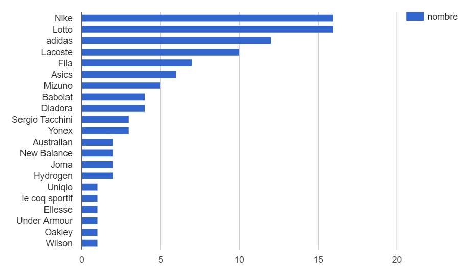 En zoomant sur le Top 20 ATP, on s’aperçoit que les meilleurs joueurs sont la chasse gardée des deux gros équipementiers du sport mondial, Nike et adidas qui se partagent la moitié des joueurs. Petite longueur d’avance pour Nike avec 6 joueurs contre 4 pour adidas. A noter que Fila fait jeu égal avec l’équipementier allemand.