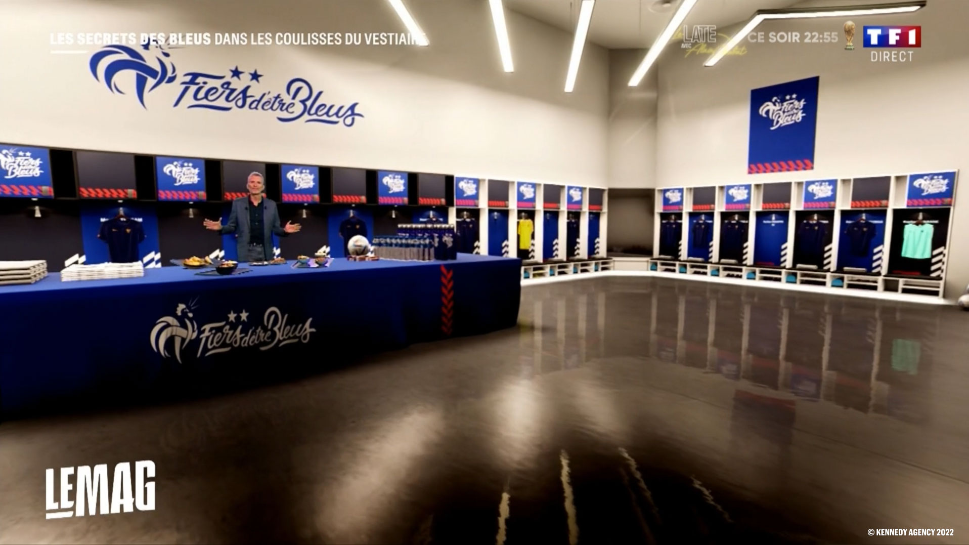De nombreuses séquences avec en toile de fond les espaces utilisés par les Bleus ont donc été mis en scène lors de nombreuses émissions (vestiaire, salle de musculation,…). « Un repérage en amont par les équipes de TF1, nous a permis de visualiser les espaces des bleus. A partir de ces sources, nous avons reconstitué chaque espace de la manière la plus fidèle. Le travail réalisé à l’antenne n’a pu se faire sans les équipes de la direction artistique de TF1 ainsi que les collaborateurs en régie et le réalisateur des matchs et des Mag. Nous opérons ensemble pour obtenir le meilleur résultat ».