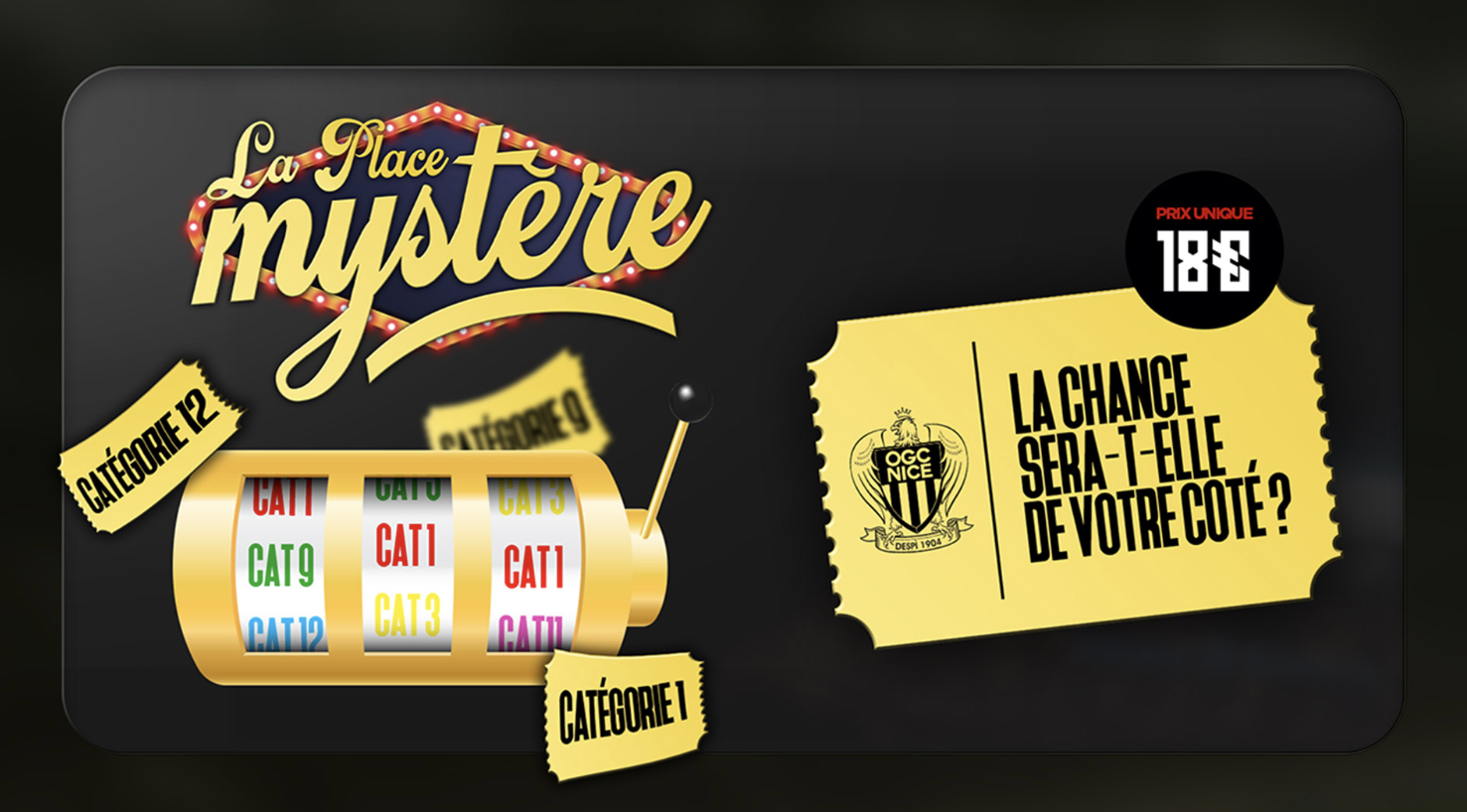 Depuis le mois de janvier, l’OGC Nice propose une toute nouvelle offre de billetterie à ses supporters. Baptisé « la place mystère », ce concept permet de réserver une ou plusieurs places (4 maximum) à un prix fixe. L’originalité de ce dispositif est que l’acheteur ne connaîtra l’emplacement de son billet que 24h avant le coup d’envoi. Le nombre de places vendues à travers cette offre est évidemment limité.