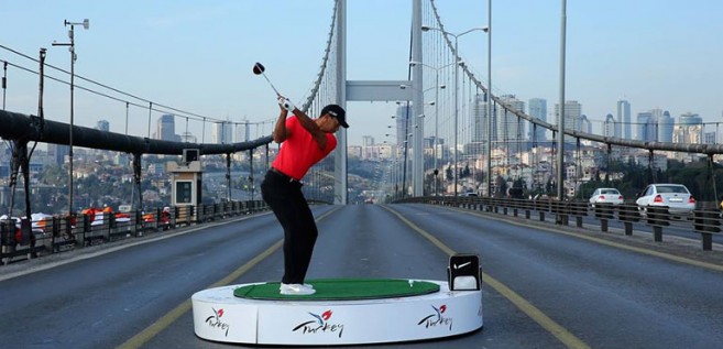 Tiger Woods envoi une balle de l’Asie vers l’Europe depuis le Pont du Bosphore à Istanbul (vidéo)