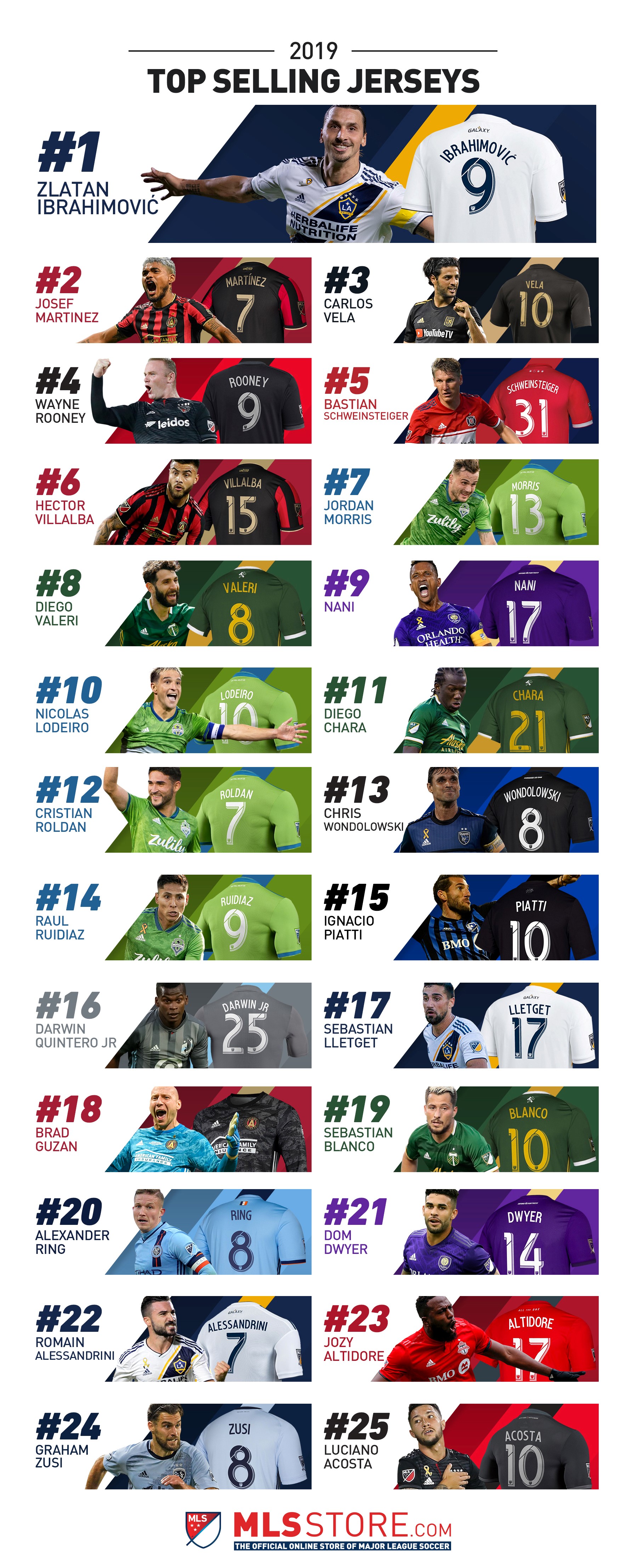 Au total, 15 franchises MLS (sur 24) sont représentées parmi les 25 plus gros vendeurs de maillots. Seattle est l’équipe la plus représentée avec 4 joueurs (Jordan Morris, Nicolas Lodeiro, Cristian Roldan, Raul Ruidiaz).