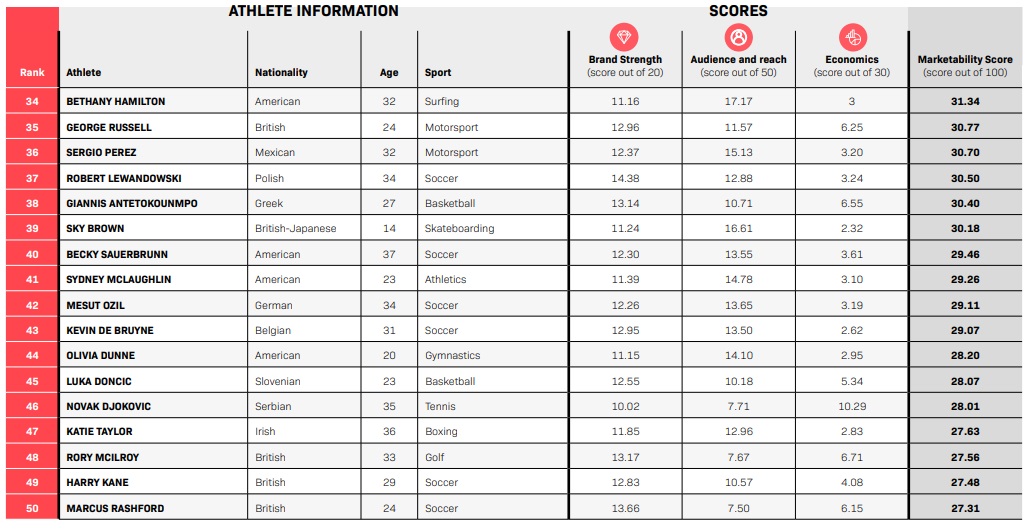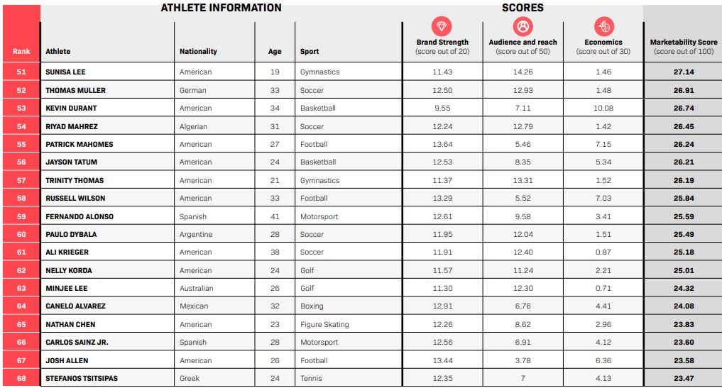TOP 50 des athlètes possédant le plus gros potentiel marketing en 2022 (SportsPro 50 most marketable athletes)
