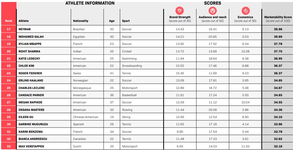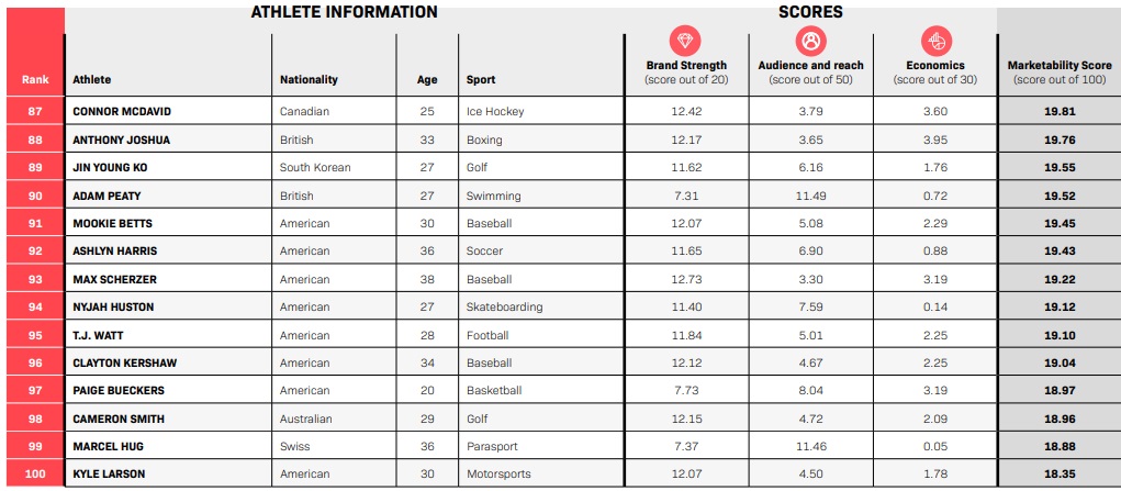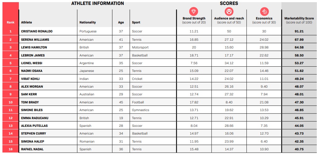 Pour dresser son classement, SportsPro a attribué une note globale « Marketability Score » (sur 100) s’appuyant sur 3 composants :