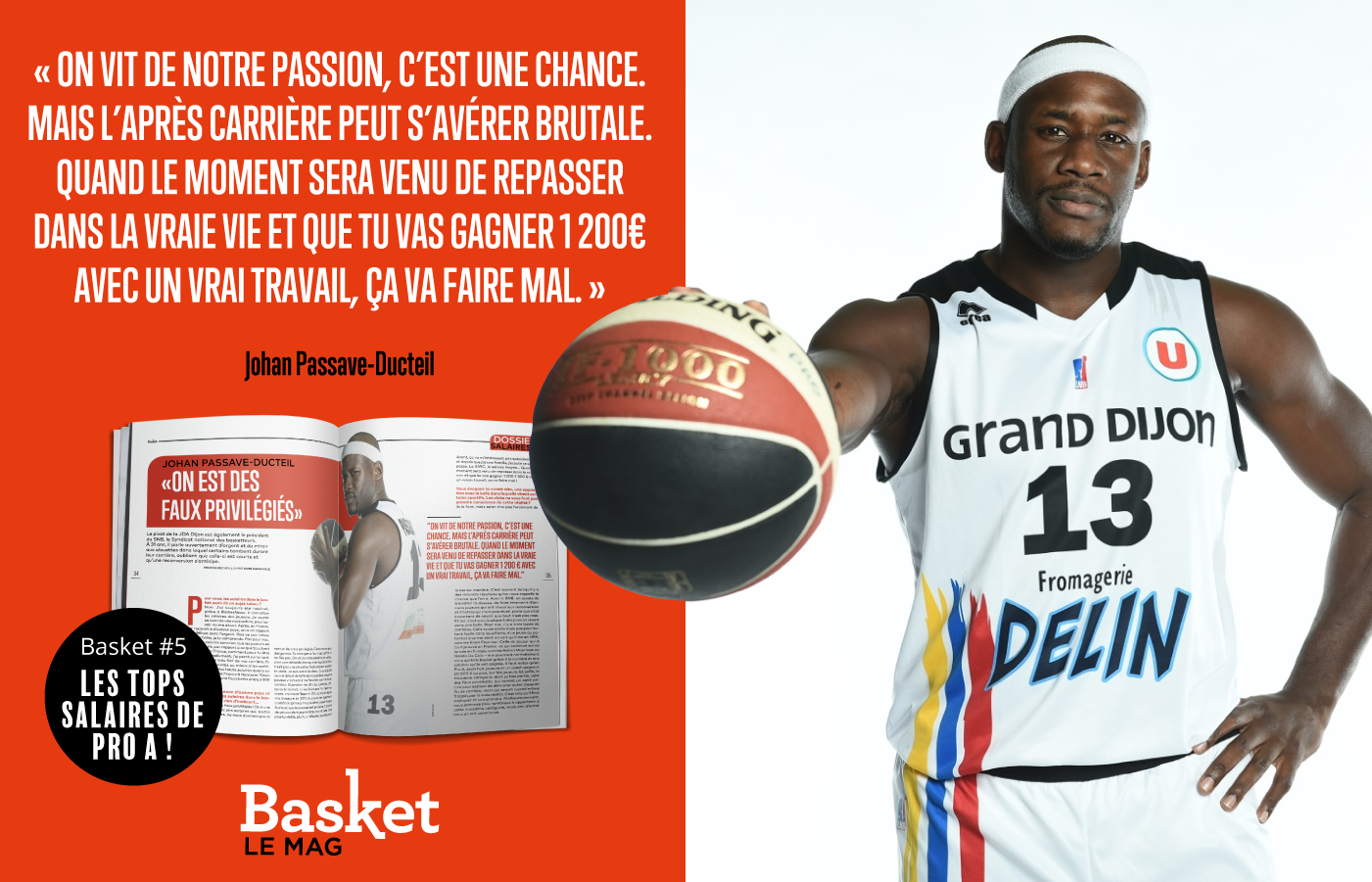 Dans son numéro de février, le mag BASKET consacre également une très belle interview de Johan Passave-Ducteil, pivot de la JDA Dijon, également président du Syndicat National des Basketteurs (SNB). « On vit de notre passion, c’est une chance. Mais l’après carrière peut s’avérer brutale. Quand le moment sera venu de repasser dans la vraie vie et que tu vas gagner 1 200€ avec un vrai travail, ça va faire mal ».