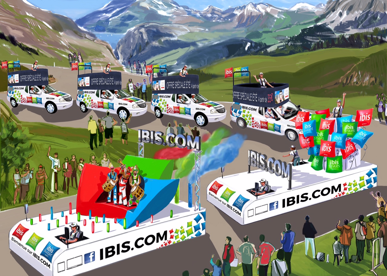 Cette année, le groupe Accor, récent partenaire de la FFF et de Roland-Garros, a décidé de rassembler ses 3 marques d’hôtels Ibis, Ibis Styles et Ibis Budget sur les routes du Tour de France 2015 grâce à un dispositif audacieux au sein de la Caravane Publicitaire.