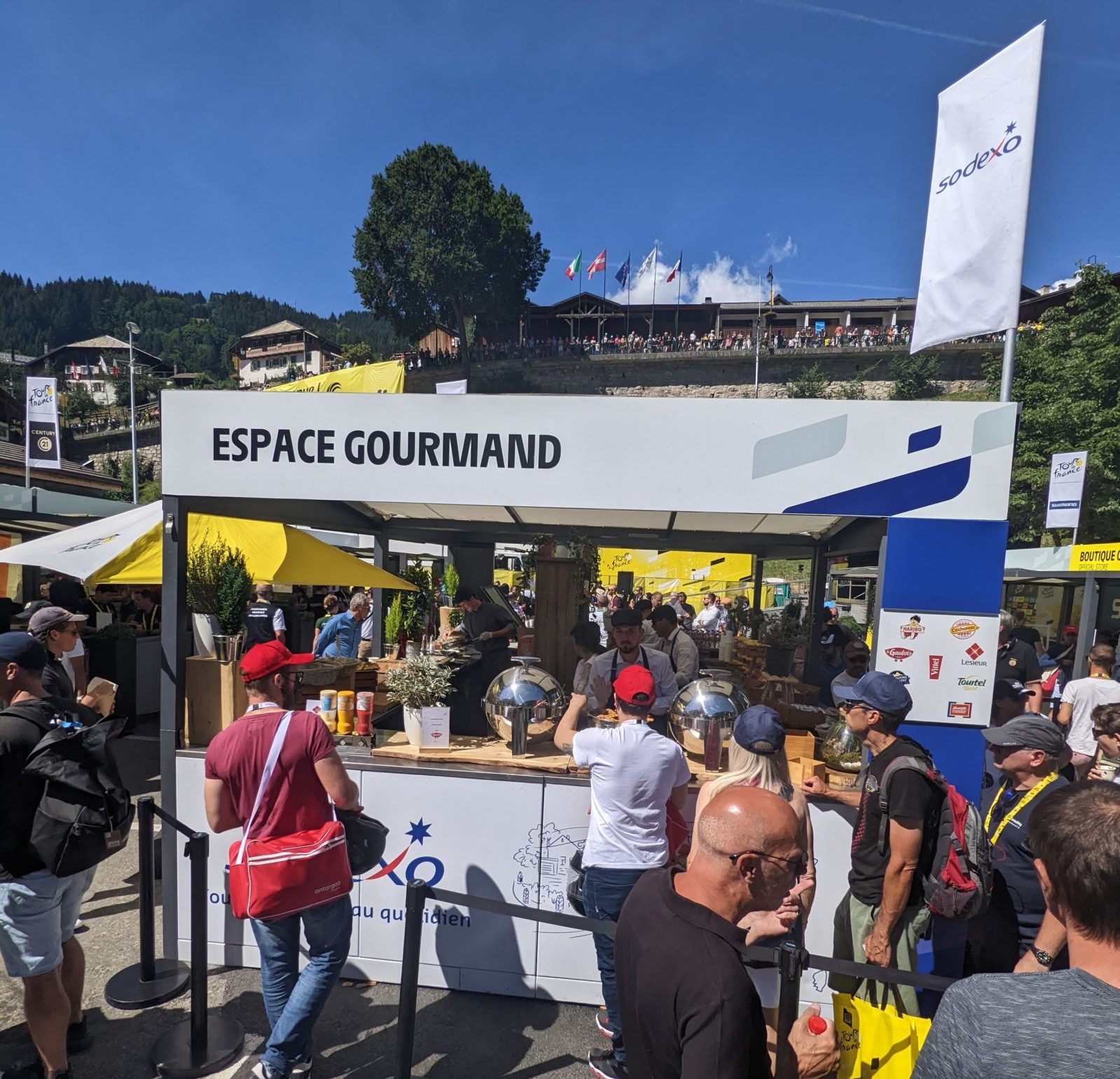 Sur les étapes du Tour, A.S.O. propose également des formules d’hospitalités comme le Relai Etape installé sur le parcours (3000 € HT pour une table de 10 personnes) ou l’Espace Galibier installé généralement à l’arrivée (50 000 € HT pour 100 personnes). Des lieux de vie qui sont également fournit par Sodexo Live!. « La restauration est indissociable de l’accueil de personnes en hospitalités. J’ai travaillé 20 ans avec Roland-Garros… Quand on veut bien accueillir les clients et invités, il faut qu’ils gardent le souvenir d’une journée mémorable, ça passe par l’accueil et la restauration… On fait avec les moyens en extérieur et en itinérance ».