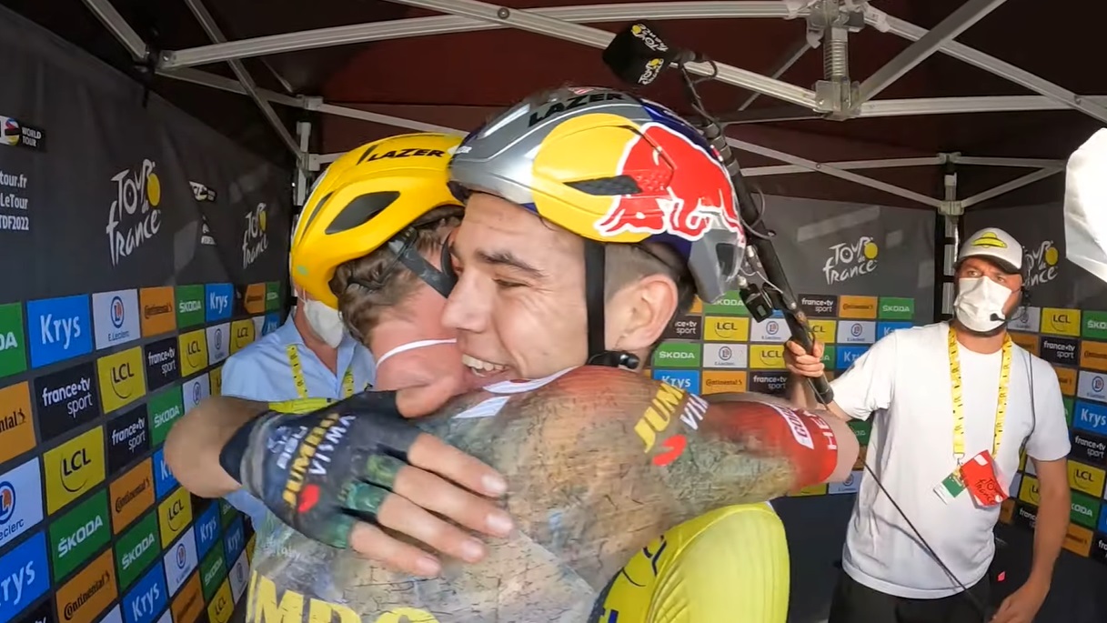 Wout van Aert saying the yellow jersey « gives you wings » after flapping his wings across the finish in a @redbull helmet is how you show value to a sponsor. Absolute pro.