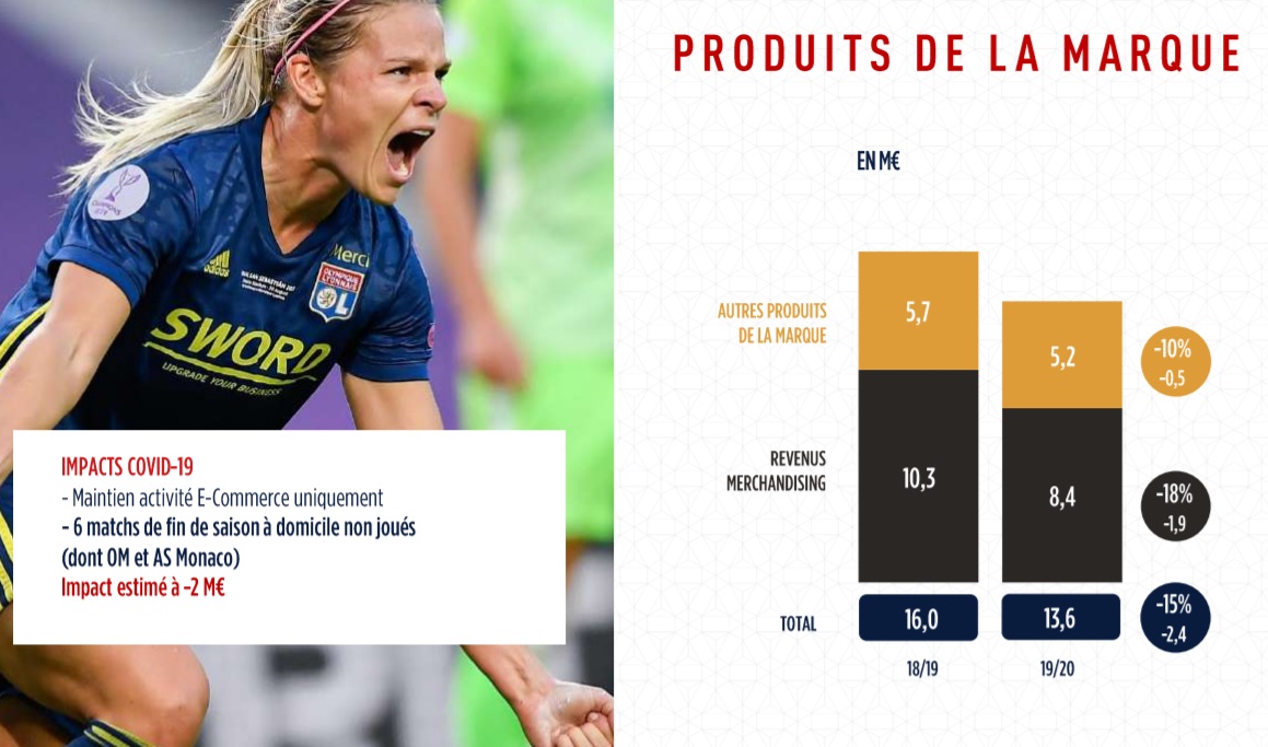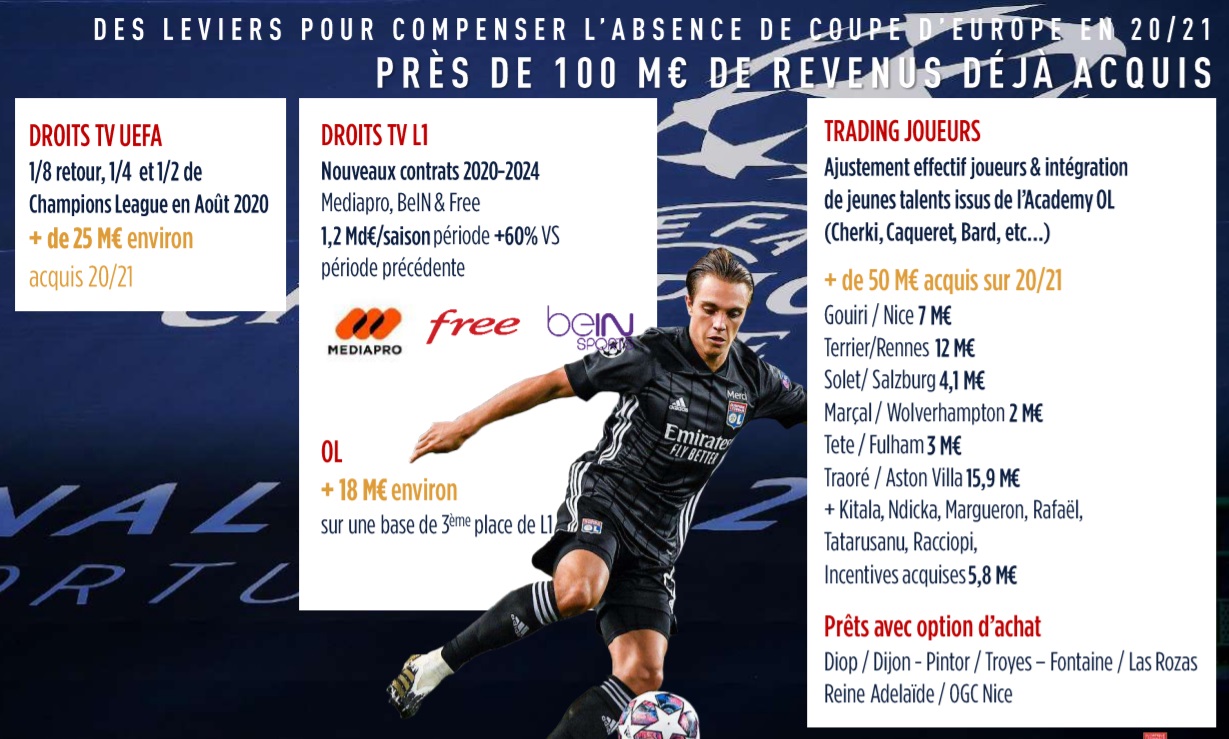 Pour tenter de compenser l’absence de revenus liés à la lucrative UEFA Champions League, l’Olympique Lyonnais compte s’appuyer notamment sur une hausse de ses revenus liés aux droits TV domestiques et à ses revenus sponsoring (objectif 20-21 à 36M€) avec l’arrivée d’Emirates, le nouveau contrat avec adidas (2020-2025), le contrat avec Mastercard pour l’équipe féminine ou encore le renouvellement du Naming avec Groupama. « On a fait un contrat de deux ans pour pouvoir en rediscuter à ce moment-là. C’est un bon contrat. Il n’est pas inférieur. Il faut tenir compte de la situation actuelle pour analyser ce nouveau contrat » a précise Jean-Michel Aulas sur le deal conclu avec Groupama.