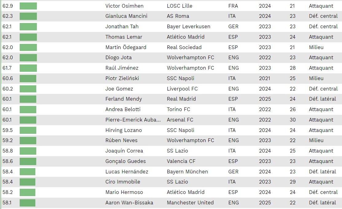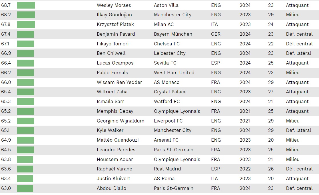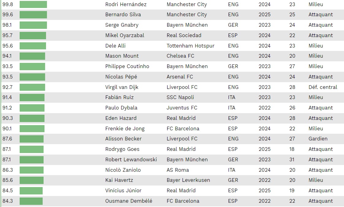 En regardant par poste, les joueurs les plus chers potentiellement sont Alisson Becker (Liverpool FC) pour les gardiens à 87,6M€, Virgil van Dijk (Liverpool FC) pour les défenseurs centraux (92,7M€), Trent Alexander-Arnold (Liverpool FC) pour les défenseurs latéraux (110,5M€), James Maddison (Leicester City) parmi les milieux (112,4M€) et Kylian Mbappé (PSG) pour les attaquants.