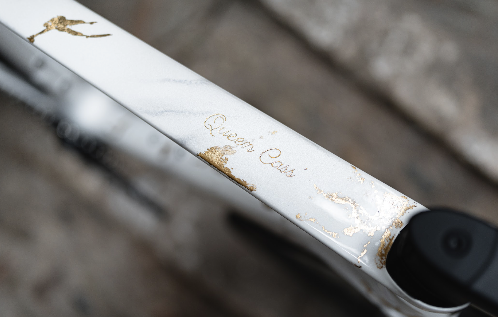 Des bases du nouveau modèle Lapierre Xelius DRS celui-ci est « orné de véritables feuilles d’or ». Sur le tube supérieur, l’inscription « Queen Cass » pour souligner son nouveau statut de reine du triathlon.