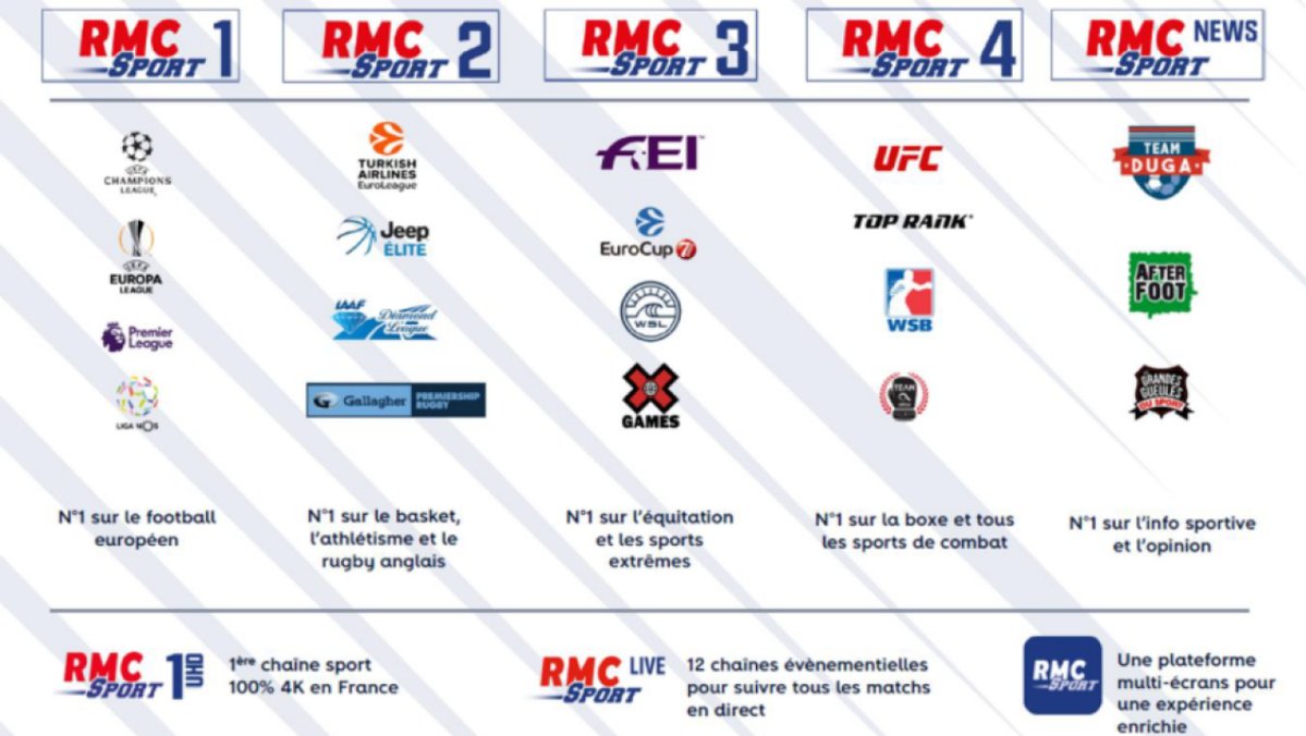 Pour le moment, aucune annonce n’a été faite pour une distribution des chaînes RMC Sport par Orange, Free, Bouygues ou pour les abonnés Canal + via les box. Pour les abonnés SFR, les chaînes sont proposées à tarif préférentiel (9€). Pour les autres, l’abonnement 100% numérique est proposée, sans engagement à 19€.