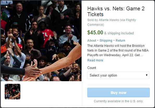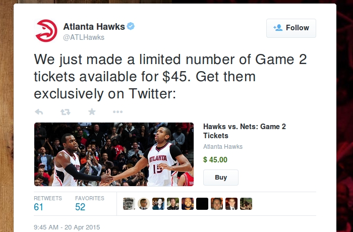 Les Atlanta Hawks qui jouent actuellement les playoffs NBA ont mis en vente des billets en exclusivité sur Twitter. Comme vous le constatez, Twitter a ajouté le bouton « acheter » qui permet de se procurer les billets sans quitter le site, tout simplement en ouvrant une fenêtre pop up.