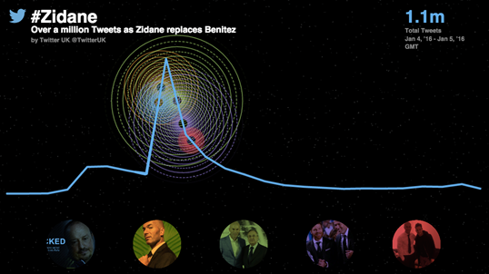 Suite à l’annonce de la nomination de Zinédine Zidane comme entraîneur du Real Madrid, les réactions ont inondé Twitter. En 24h, ce sont plus d’un million de tweets mentionnant Zidane, #Zidane ou Zizou qui ont été publié.