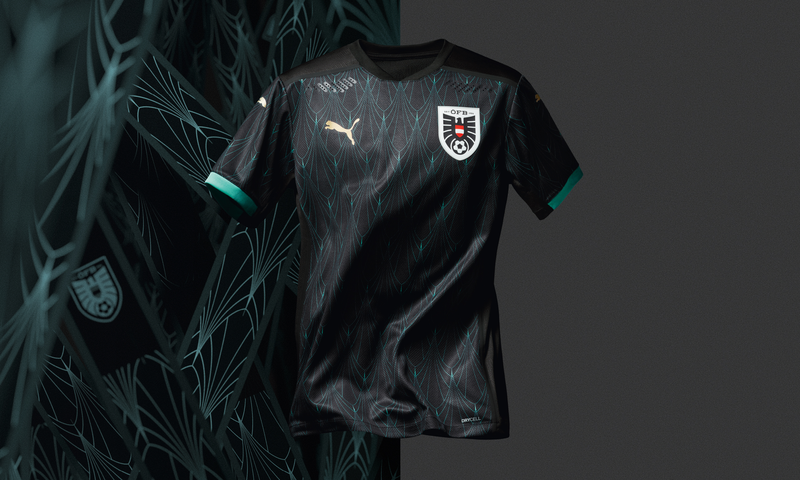 L’Autriche mise sur une base noir et des motifs turquoises pour son maillot extérieur 2020. David Alaba et les siens porteront ce jersey pour la première fois face à la Macédoine du Nord, le 16 novembre.