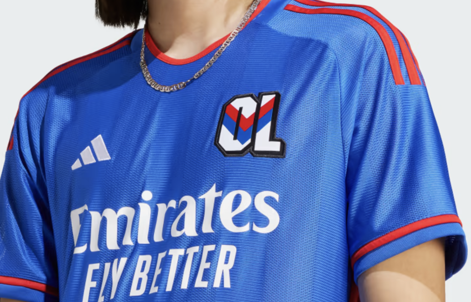 Les trois bandes de la marque allemande sur les manches sont rouges. Un liseré de la même couleur est également présent au niveau du col et des manches. L’écusson lui, a aussi été « revisité ». Dans un style rétro, les deux lettres « OL » sont brodées en blanc qu’un scapulaire rouge et bleu vient traverser. Un ancien logo du club utilisé de 1989 à 1996.
