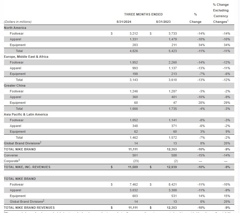 Sur la période juin-août, Nike INC a enregistré un chiffre d’affaires de 11,6 milliards de dollars, en baisse de 10 % par rapport à l’année précédente et de 9 % sur une base neutre en termes de change.