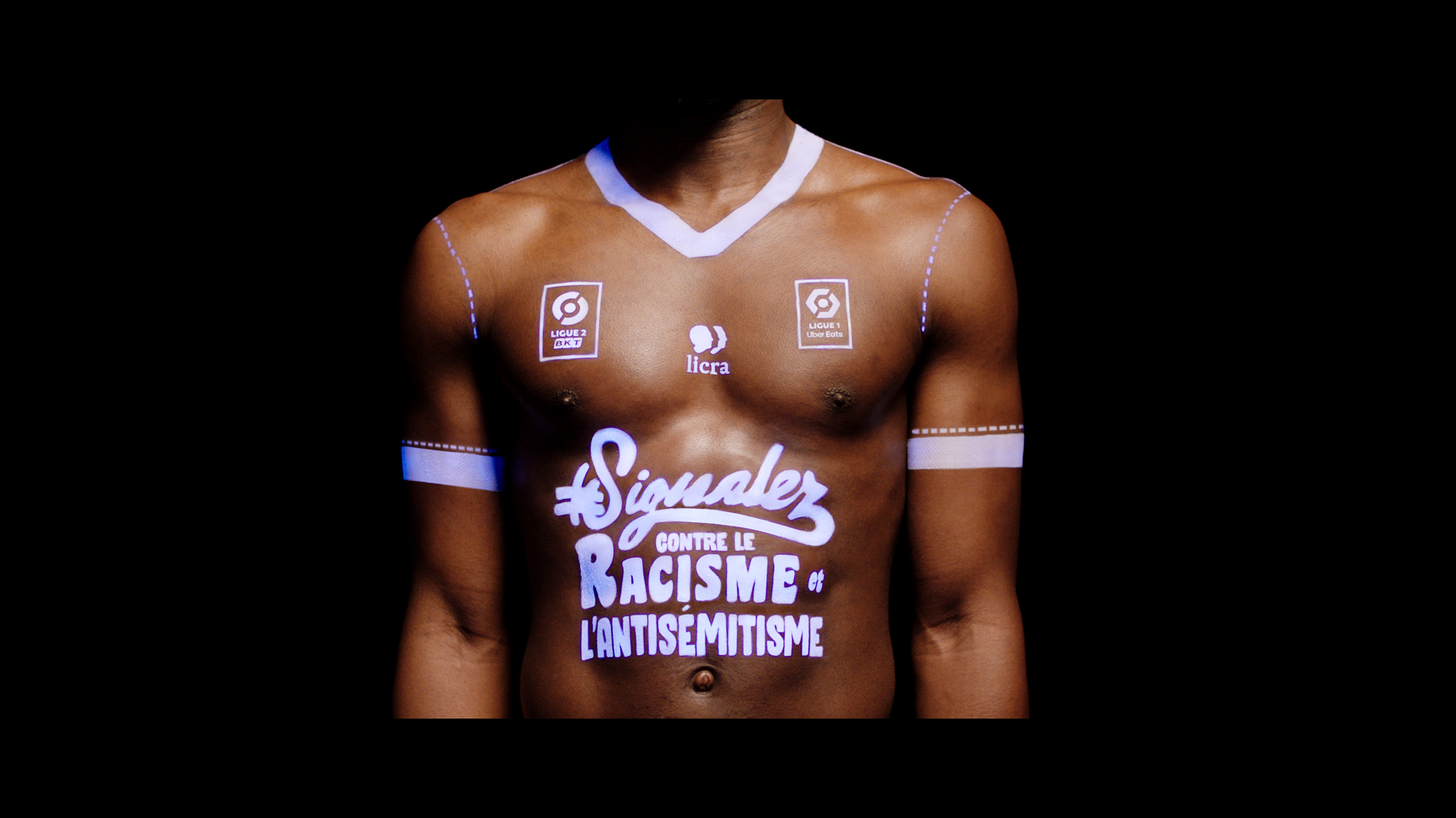 Inspiré des présentations de nouveaux maillots de football, le spot publicitaire réalisé par l’agence Rosbeef! met en avant un body painting sur des corps de différentes couleurs avec le message « Contre le racisme et l’antisémitisme, #Signalez ».