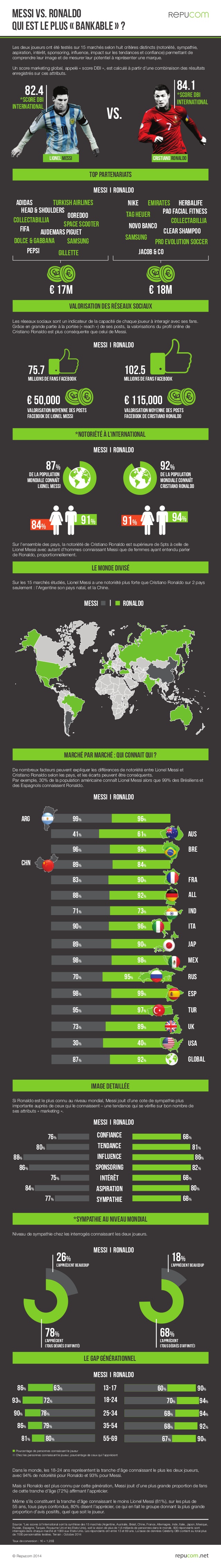 Dans l’infographie ci-dessous, Repucom revient sur les différents sponsors des deux hommes (une erreur pour Pro Evolution Soccer qui n’est plus partenaire de Ronaldo sauf erreur de notre part) et présente notamment la valorisation des pages Facebook de Messi et Ronaldo. Avec plus de 100 millions de Fans, un post du portugais serait valorisé à 115 000€ contre 50 000€ pour l’argentin qui regroupe 75 millions de Fans. Sur les 15 marchés étudiés, si Ronaldo est plus connu au niveau mondial, Messi jouit d’un cote de sympathie plus importante. Au final, c’est Ronaldo qui apparaît comme plus bankable que Messi avec un score de 84,1 contre 82,4.