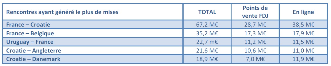 Sans surprise, la finale entre la France et la Croatie a enregistré l’activité la plus importante durant le mois de compétition avec 67 millions d’euros, un record de mises pour une rencontre. Les autres confrontations de la Coupe du Monde ayant généré le plus de mises sont la demi-finale France – Belgique (35 M€) suivi du quart de finale Uruguay- France (23 M€).
