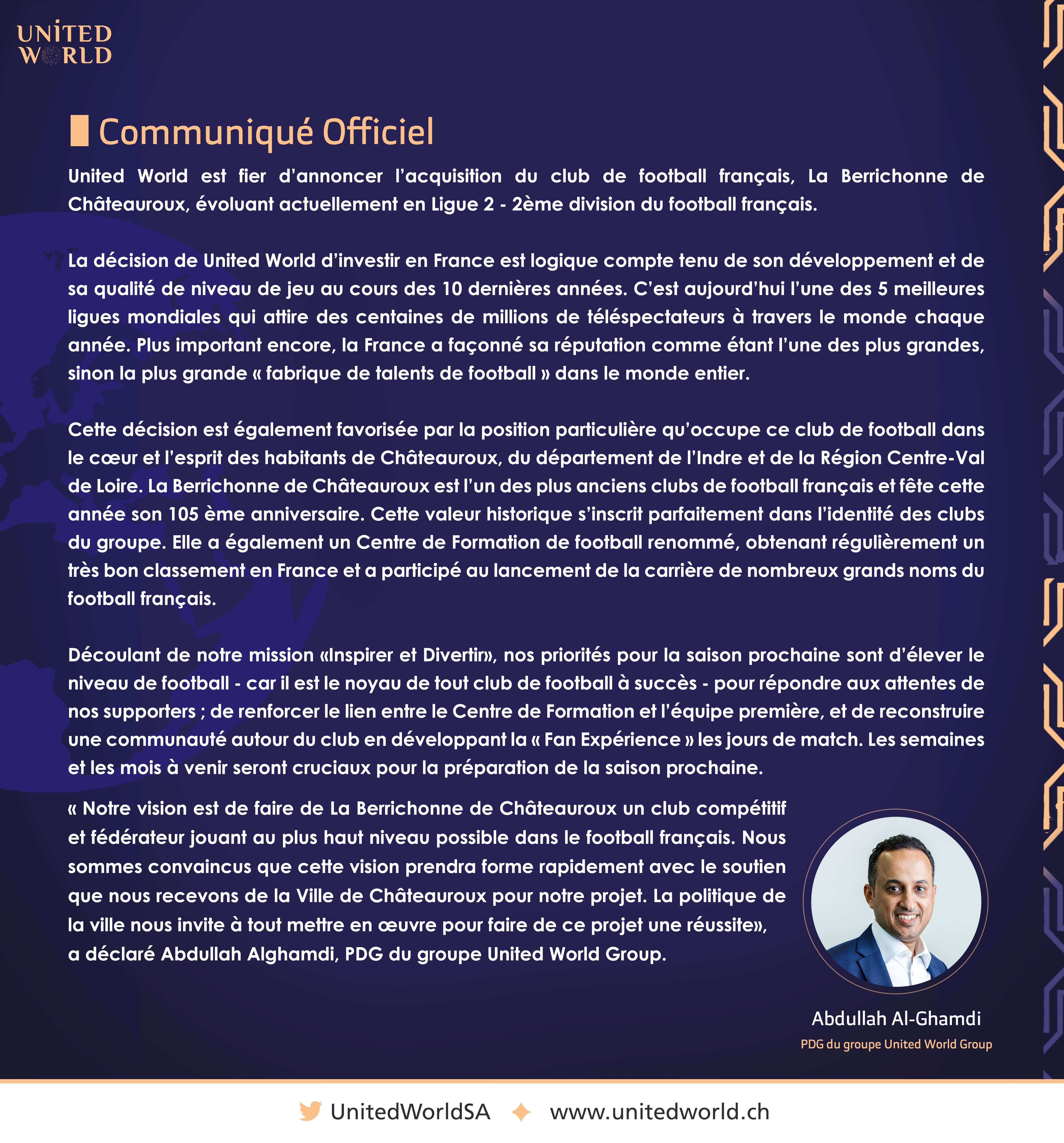 Comme le précise L’Equipe, le rachat a été conclu à hauteur de 80% des parts. « Notre vision est de faire de La Berrichonne de Châteauroux un club compétitif et fédérateur jouant au plus haut niveau possible dans le football français. Nous sommes convaincus que cette vision prendra forme rapidement avec le soutien que nous recevons de la Ville de Châteauroux pour notre projet. La politique de la ville nous invite à tout mettre en œuvre pour faire de ce projet une réussite», a déclaré Abdullah Alghamdi, PDG du groupe United World Group, dans le communiqué.