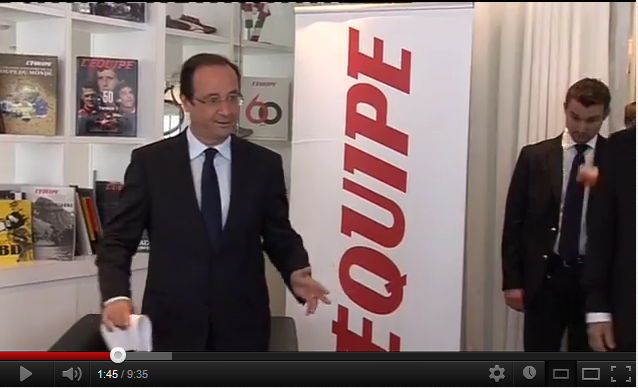 François Hollande était dans les locaux du quotidien L’Equipe hier (Entrevue disponible dans le journal aujourd’hui). Le candidat socialiste à l’élection présidentielle était accompagné d’Emmanuel Vals, son directeur de la communication; de Valérie Fourneyron, en charge du sport dans sa campagne et de l’ancien judoka Thierry Rey. Plongez pendant près de 10 minutes dans les coulisses de cette visite.