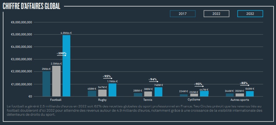 En 2032, le sport professionnel numéro 1 en France devrait rester le football avec des revenus estimés à 4,9 milliards d’euros. Derrière, Two Circles place le rugby, le tennis et le cyclisme.