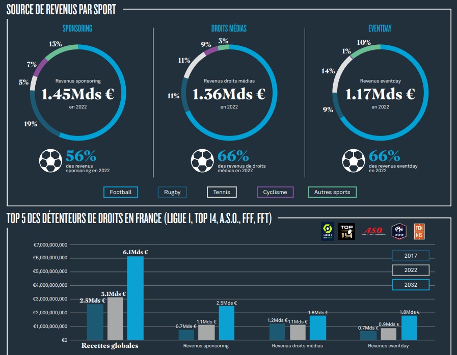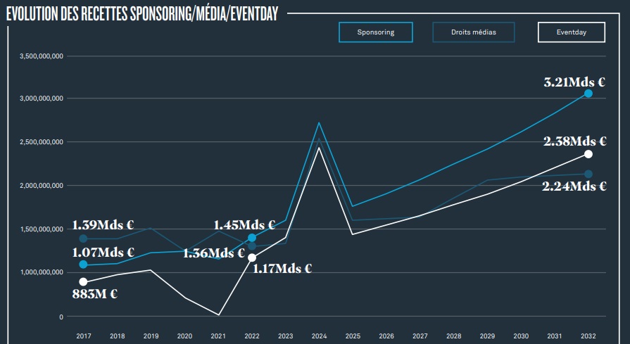 Pour 2032, l’agence prévoit ainsi un fort développement des revenus liés au sponsoring grâce notamment à la monétisation des produits digitaux. Ainsi, l’étude prévoit que les recettes sponsoring soient la principale source du sport professionnel en 2032 avec 3,21 milliards d’euros devant l’eventday (2,38 milliards €) et les droits TV (2,24 milliards €).
