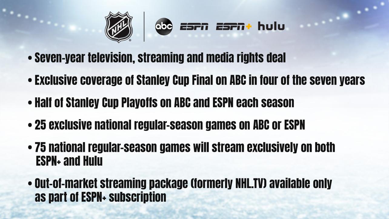Dans le cadre de cet accord, la chaine ABC diffusera les finales de la Stanley Cup lors de 4 saisons sur les 7 du contrat. ABC et ESPN diffuseront également la moitié des Playoffs.