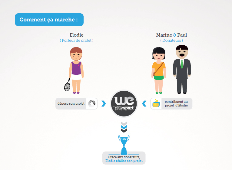 Comme sur la plupart des plateformes de sponsoring participatif, les « dons » effectués par les internautes ne seront pas dénués de tout intérêt. En effet, en échange de son soutien à un projet, le donateur recevra une contrepartie en nature de la part du porteur de projet (partage d’expérience, « money can’t buy », contreparties matérielles etc…). Côté business model, le fonctionnement de We Play Sport est classique au fonctionnement des sites de crowdfunding. Ainsi, le dépôt de projets est totalement gratuit, We Play Sport prélèvera une commission (8,2% + 1,8% de frais bancaires transactionnels soit 10% TTC) uniquement sur les projets aboutis et le cas échéant sur les postes de dépenses entièrement financés lorsque le porteur de projet n’a pas atteint son objectif à 100%.