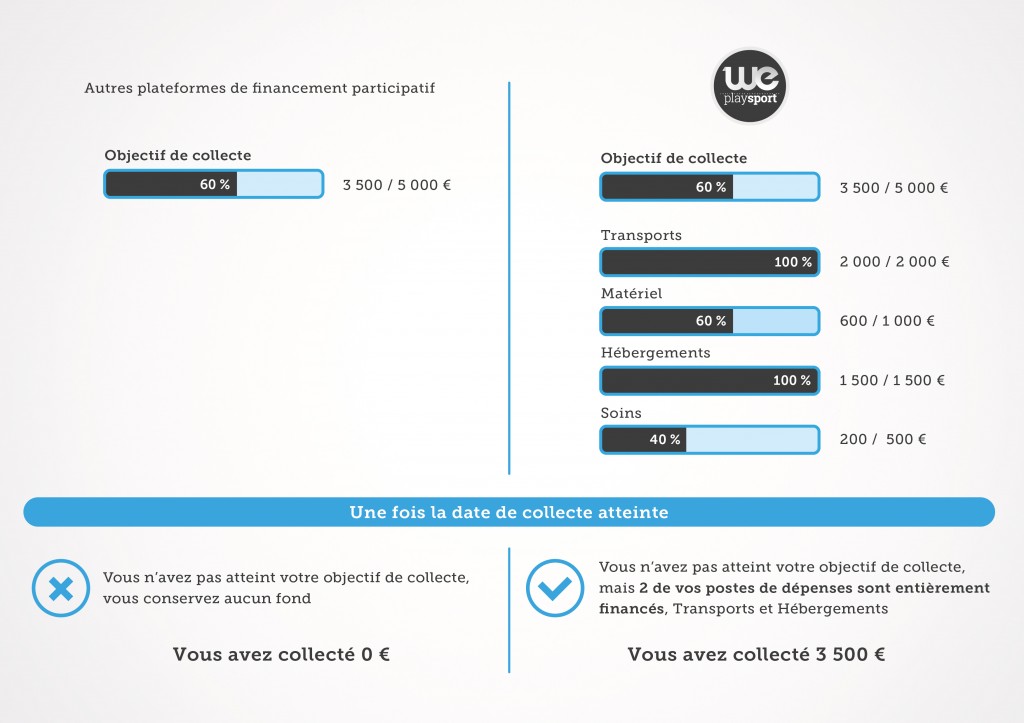 Si la majorité des plateformes de financement participatif prône le principe du «tout ou rien», We Play Sport va plus loin en proposant au porteur de projet, même s’il n’a pas atteint son but à 100% de conserver une partie des gains récoltés. A la fin de la collecte, chaque poste de dépenses entièrement financé pourra être conservé par le porteur de projet, ce qui donnera également accès au donateur à la contrepartie qu’il aura choisie. Les donateurs qui auront choisi un autre poste de dépenses non financé seront eux intégralement remboursés.