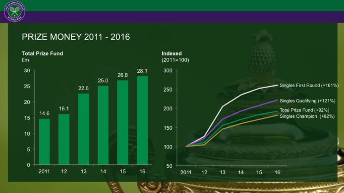 Au total, ce sont 28,1 millions de livres (36,2M€) que se partageront les différents acteurs. En 2011, Wimbledon offrait 14,6 millions de livres. Chez les hommes comme chez les femmes, le vainqueur du tournoi en simple empochera un chèque de 2 millions de livres soit environ 2,57 millions d’euros (+6,4% vs 2015). A titre de comparaison, le vainqueur de Roland-Garros 2016 repartira cette année avec 2 millions d’euros.