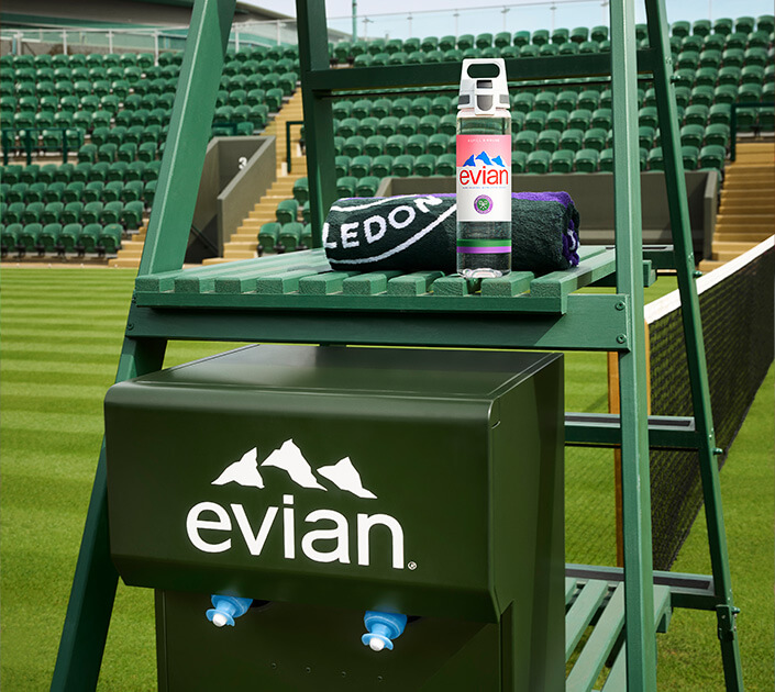 Une chaise d’arbitre qui sera également logoté Evian, comme ces dernières années, à l’arrière. Pour cette édition 2023, la marque d’eau propose une fontaine aux joueurs et joueuses qui pourront utiliser des gourdes réutilisables.